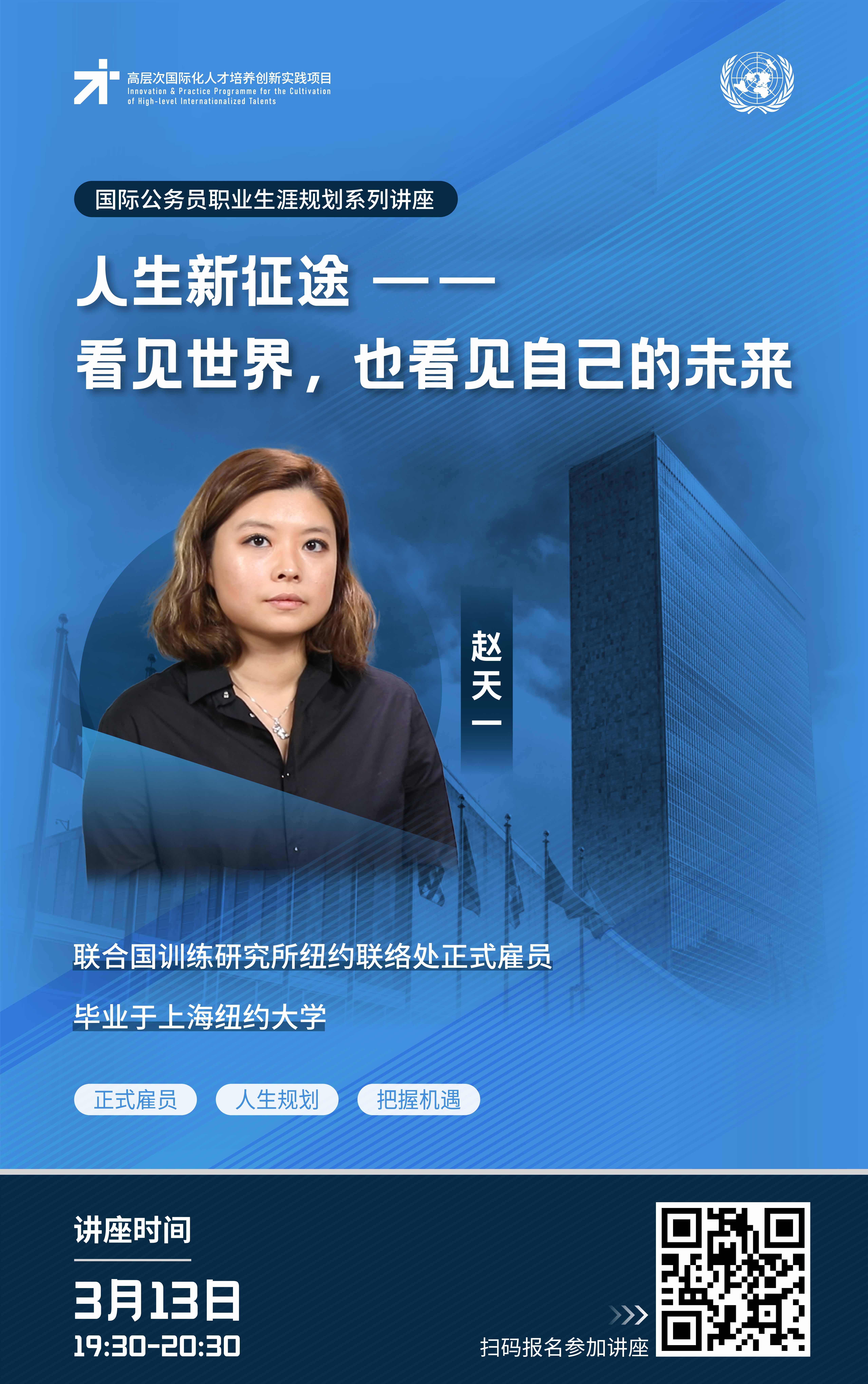 二、内容简介:2017年,赵天一从上海纽约大学毕业,前往纽约大学进行深造。同年她进入联合国训练研究所实习,毕业后她成功转正,开启了自己向往的国际组织职业生涯。她用亲身经历告诉我们:探索和热情,是面对未知的最好本领,也是自我成长的最佳推动力。