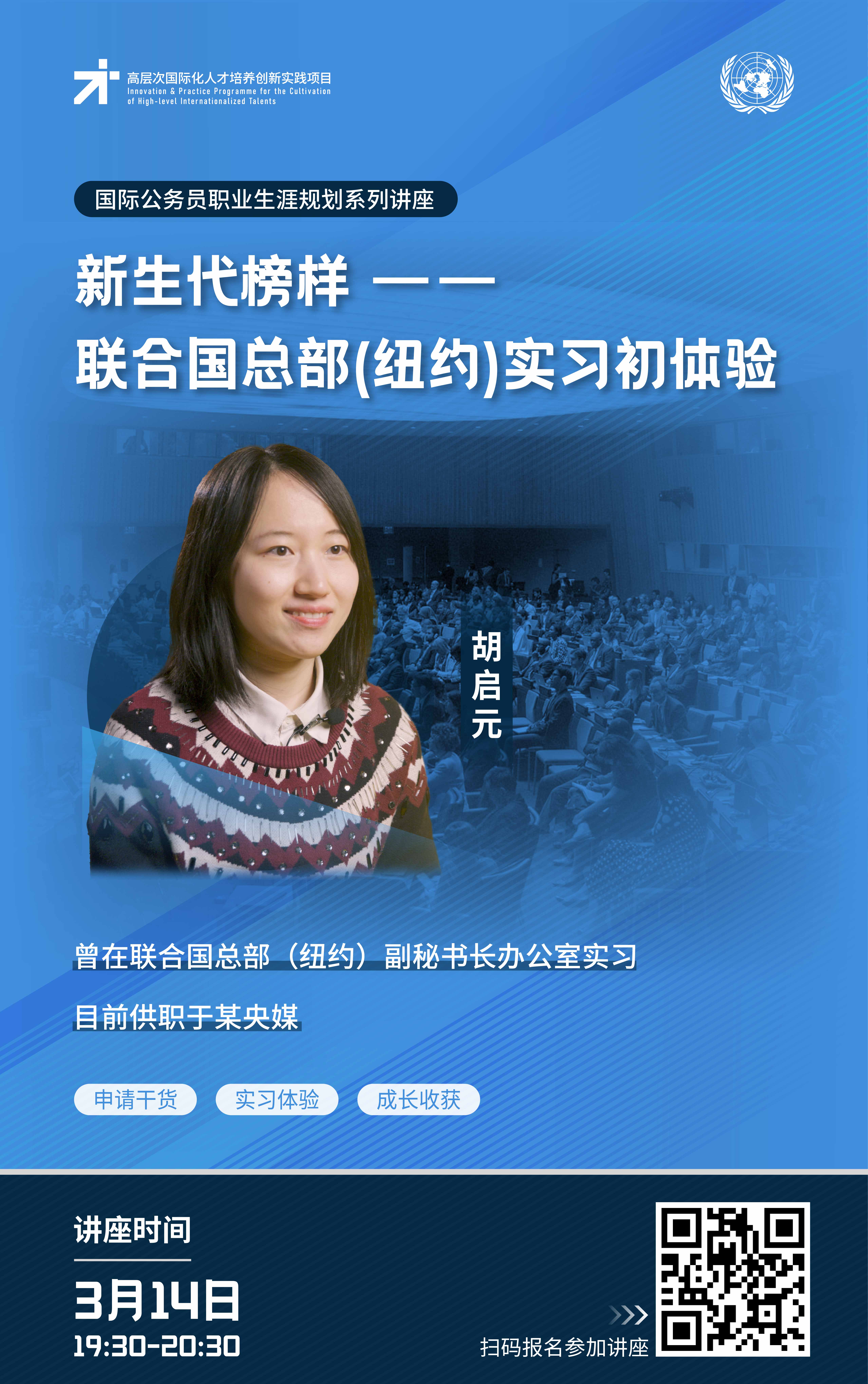 三、主讲人:胡启元,曾在联合国总部(纽约)副秘书长办公室实习,目前供职于某央媒