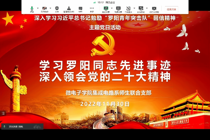 11月30日,为深入学习贯彻习近平新时代中国特色社会主义思想和党的二十大精神,进一步提升党支部的战斗堡垒作用,微电子学院集成电路系师生联合支部全体党员通过腾讯会议平台,围绕习近平总书记给“罗阳青年突击队”的回信,开展了以“学习罗阳同志先进事迹,深入领会党的二十大精神”为题的主题党日活动。本次活动由支部书记刘炜同志主持。