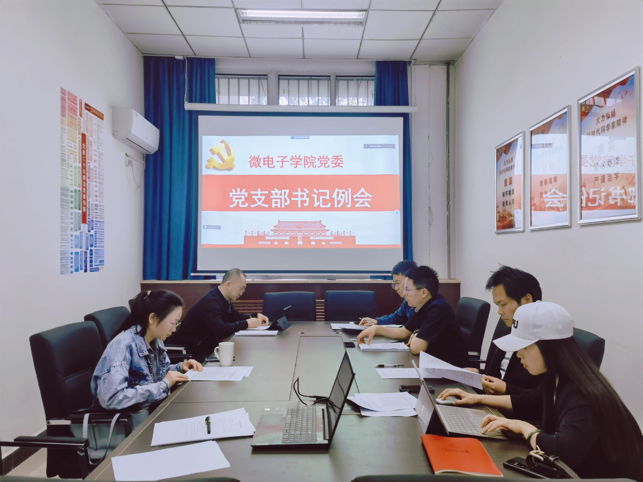 4月17日,微电子学院在学院楼140会议室召开党支部书记例会,研究部署学习贯彻习近平新时代中国特色社会主义思想主题教育工作,学院党委委员、党支部书记参加会议,会议由学院党委书记甘雪涛主持。