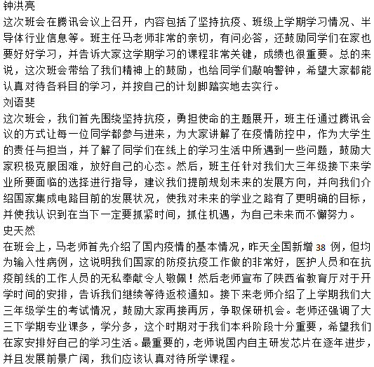 17021701班与17021702班“坚持抗疫、勇担使命”主题班会上,班主任马彦昭老师强调当前疫情尚未解除,希望同学们坚持抗疫到底,每日能够按时填报疫情防控信息,为顺利返校做好准备。接着,马老师对上学期班级学生期末考试情况进行了总结分析,介绍了目前我国集成电路产业的发展现状,鼓励同学们在战“疫”的同时能够勇担使命,科学规划好自己的学习生活和职业生涯,树立远大目标,为我国集成电路产业的发展贡献力量。最后,同学们在线上开展热烈的讨论,纷纷发表了自己的想法与体会。
