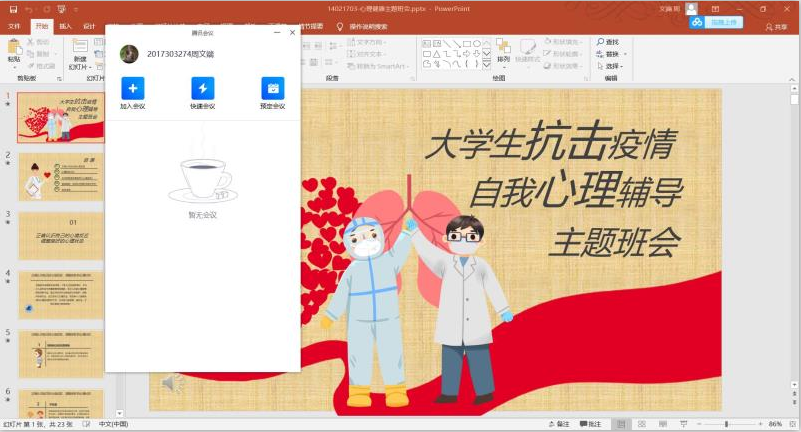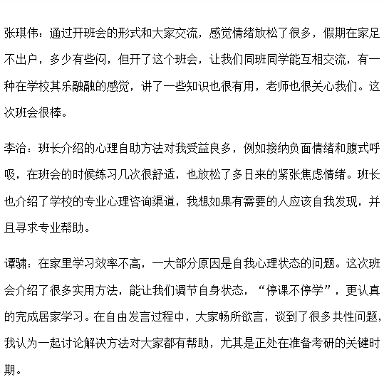 17021703班“安心定志,你我同行”主题班会上,小班长首先通过疫情期间的心境反应介绍了心理自助的主要方法,包括接纳负面情绪、不恐慌、保证合理睡眠,腹式呼吸法等,同时对学校专业心理援助的渠道以及如何识别是否需要援助进行了详细说明,使同学们受益良多,对如何科学做好“停课不停学”、集中注意力认真学习以及如何做好心理自我防护有了更深入的了解。最后,在班主任王昆老师的组织下,大家相聚云端,依次讲述自己的居家学习生活体会,遇到有困难问题的学生,全班同学共同献计献策、共同克服困难。这场班会不仅促进了师生间的交流互动,更促进了学风班风建设,增强了班级凝聚力。