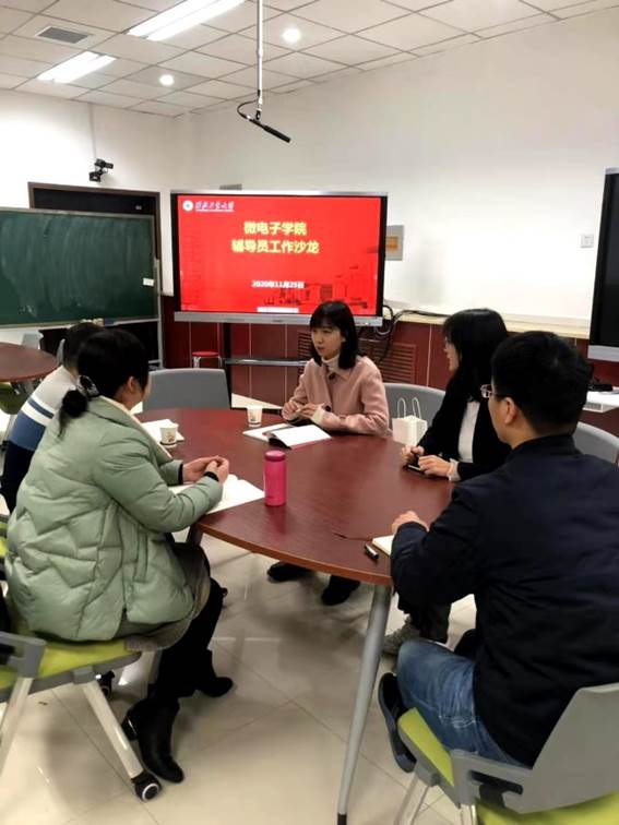 为进一步加强辅导员队伍建设,促进辅导员学生工作管理水平提升,2020年11月25日,微电子学院举办了辅导员工作沙龙活动,特邀计算机学院辅导员高云和电子信息学院副教授高永胜与来院交流分享工作经验。学院党委副书记彭蓉、本科生辅导员李伟和研究生辅导员梁秋菊参加了本次活动。沙龙由彭蓉副书记主持。