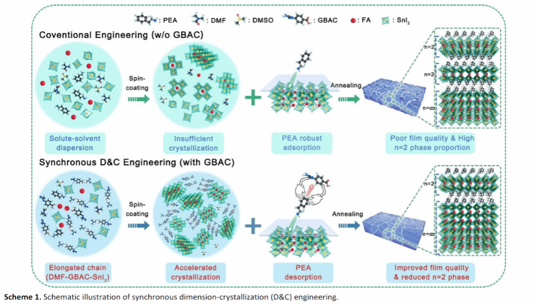锡基钙钛矿具有低毒性、合适的带隙和良好的光电性质在光伏领域受到密切关注,其有效开发对于发展环境友好型光伏技术至关重要。然而,锡基钙钛矿亚锡易氧化、结晶速率快等问题导致薄膜缺陷态密度高,器件光电转换效率与铅基相差甚远。引入大体积阳离子形成2D/3D结构虽可调控结晶过程,并抑制亚锡氧化,但其中低维相厚度以及分布的无序性会引起不良的载流子传输,从而对光伏性能造成严重影响。