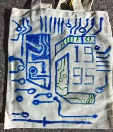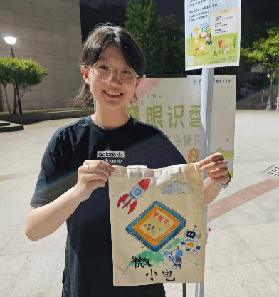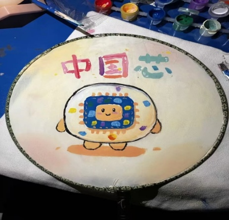 传统手作融合科技元素,展现学科特色 活动现场,同学们将微电子学科特色融入手作设计:在涂鸦帆布袋上,既有草木渲染的“春”字,也有精密芯片的科技图案,传统水墨与电路线条交织,展现艺术巧思。纸扇创作区,素白扇面被泼墨般的色彩晕染成流动的星河。