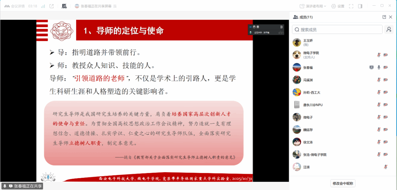 为优化导学关系,提升研究生培养质量,10月31日上午,微电子学院组织召开2025年导师培训会。会议采用线上线下相结合的方式进行,邀请西安电子科技大学微电子学院张春福教授作题为“亦师亦友,琢玉成器——导师如何与研究生相处”的报告,学院副院长王少熙主持会议,全体研究生导师参会。