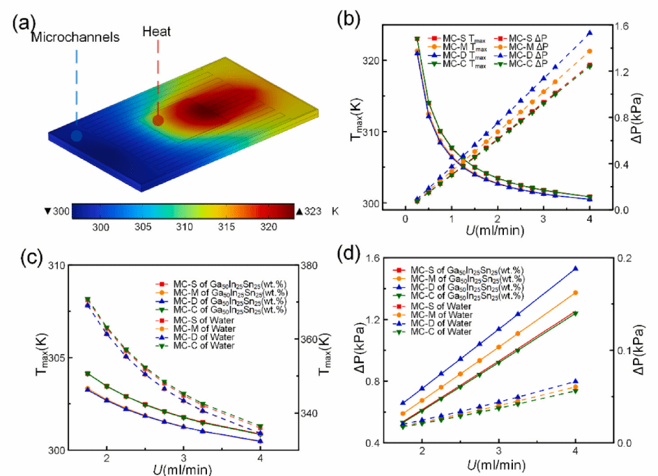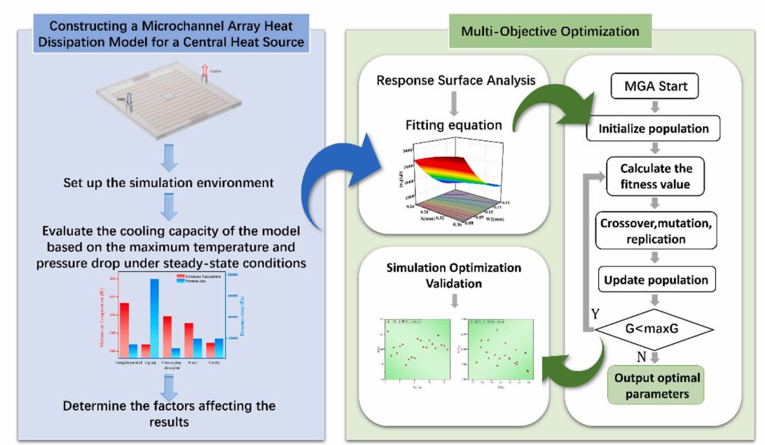 高热流密度是制约微型化高功率微电子系统性能与可靠性的关键因素。团队提出了一种基于液态金属(LM)的微流体冷却系统,通过数据驱动的计算框架优化改进的遗传算法(LC-GA),旨在为高密度集成系统提供高效的热管理解决方案。通过在硅基板上集成LM近端冷却与微通道散热技术,团队开发出一种异构三维互连冷却架构,能够通过算法引导的参数调优实现热性能优化。为验证该方法,我们设计、制备并实验测试了四种不同微通道结构。将LM引入通道后,对模拟热源进行了实验冷却测试和热性能仿真。实验结果表明,通过计算参数确定优化的LM微流体冷却系统,可有效散热功率高达800W的芯片,同时保持稳定热性能。此外,结合响应曲面法与改进的LC-GA进行多因素敏感性分析和多目标优化,实现了热阻与压降平衡的最优设计参数和运行参数的自动确定。优化后的配置将芯片最高温度降至约357.54K,降低了系统压力要求,并将性能评估标准(PEC)提升至2.327。本研究提出了一种数据驱动的优化方案,通过算法辅助的热设计支持高性能集成微系统开发。成果以“Liquid metal microfluidic cooling system for high-efficiency thermal management via learning-based genetic algorithm”发表于《ENGINEERING APPLICATIONS OF ARTIFICIAL INTELLIGENCE(1区TOP)