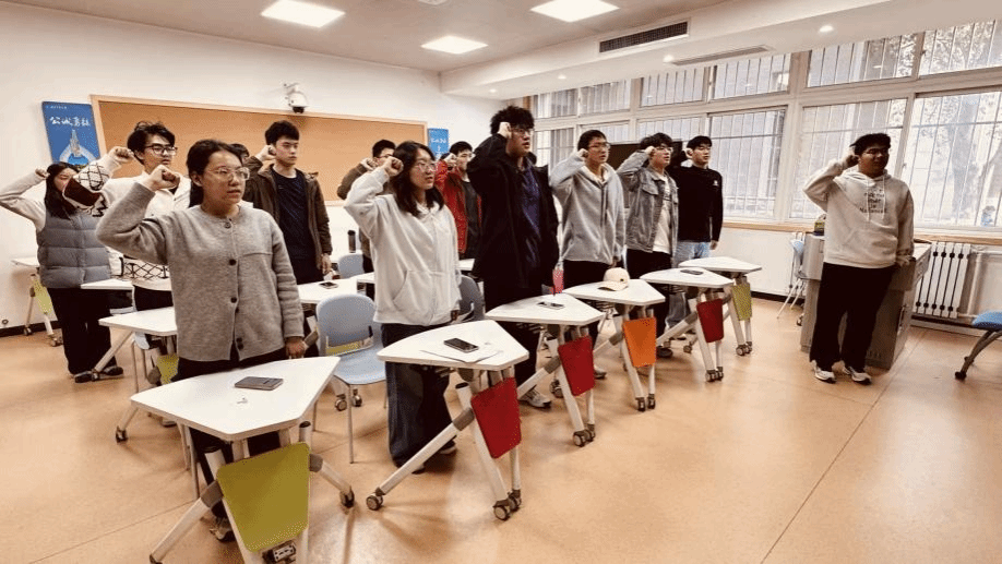 活动最后,全体团员面向团旗,举起右拳庄严宣誓,重温入团誓词。铿锵有力的誓言在教室回荡,既是对共青团组织的庄严承诺,更是对赓续红色薪火、勇担时代使命的坚定表态,每一位团员再次坚定了“永远跟党走”的信念,明确了作为新时代共青团员的责任与担当。